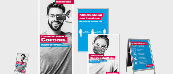 Schon seit Wochen bietet die Handwerkskampagne über das Werbemittelportal Handwerksbetrieben individualisierbare Motive rund um das Thema Corona zum Download an. Abstands- und Hygieneregeln werden uns noch eine Weile begleiten und so wurde das Angebot jetzt um konkrete Produkte erweitert, mit denen in den Betrieben auf die Einhaltung der Abstandsregeln, das Tragen von Mundschutz oder die Bitte um bargeldlose Zahlung hingewiesen werden kann.