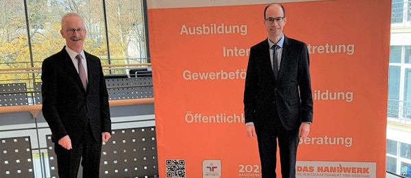 Die 87. Vollversammlung der Handwerkskammer Karlsruhe wählt Walter Bantleon (im Bild rechts) einstimmig zum neuen Hauptgeschäftsführer. Der 44-jährige Volljurist konnte in einem mehrstufigen Auswahlprozess überzeugen. Bantleon wird Nachfolger des langjährigen Hauptgeschäftsführers Gerd Lutz (im Bild links), der Anfang 2022 in den Ruhestand geht.
