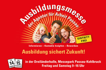"Ausbildung sichert Zukunft!" - Unter diesem Motto veranstaltet die Agentur für Arbeit Passau am 15. und 16. März 2019 eine Ausbildungsmesse in der Dreiländerhalle in Passau. Auch die Handwerkskammer ist auf der sogenannten Handwerkermeile mit spannenden Mitmach-Werkstätten anzutreffen. Informieren Sie sich außerdem über die 130 verschiedenen Ausbildungsberufe im Handwerk. Mehr Infos unter hwkno.de.